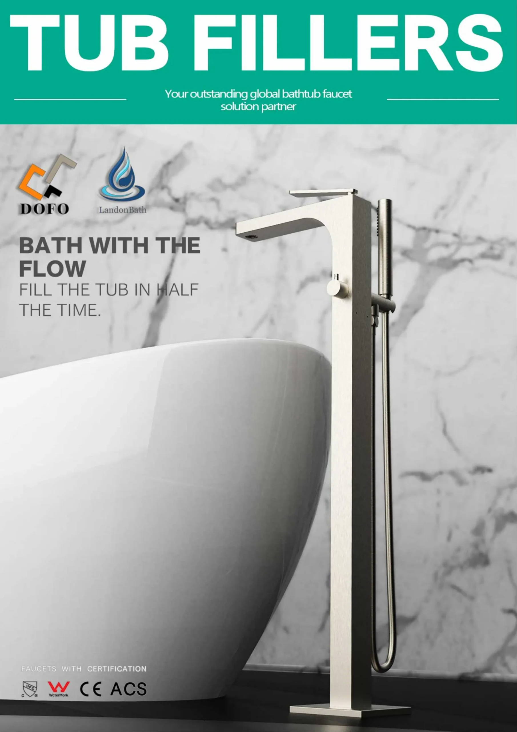 Discover DF-02018-2PC freestanding bathtub faucet. Floor-mounted chrome tub filler with brass body, hand shower, modern square design, and global certifications. Ideal for luxury bathrooms.