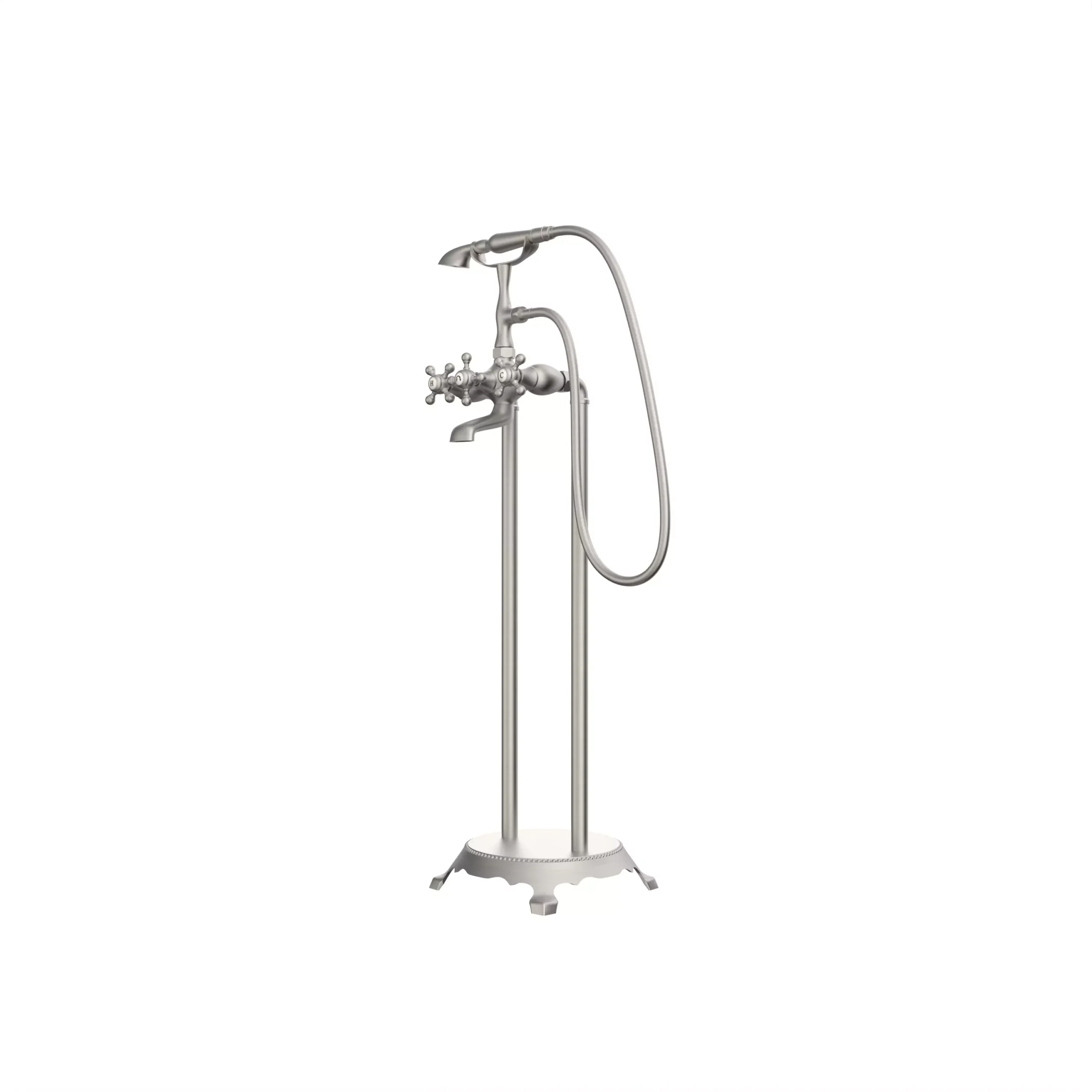 The tall and stable tripod base includes brackets and bolts to secure the faucet to the floor, ensuring a sturdy and stable fit.