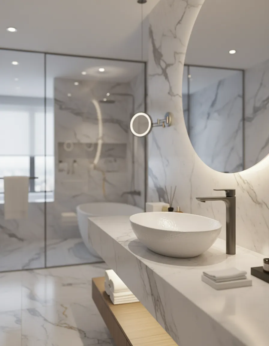 - Europe: apartments and high-end bathrooms with modern gold accents