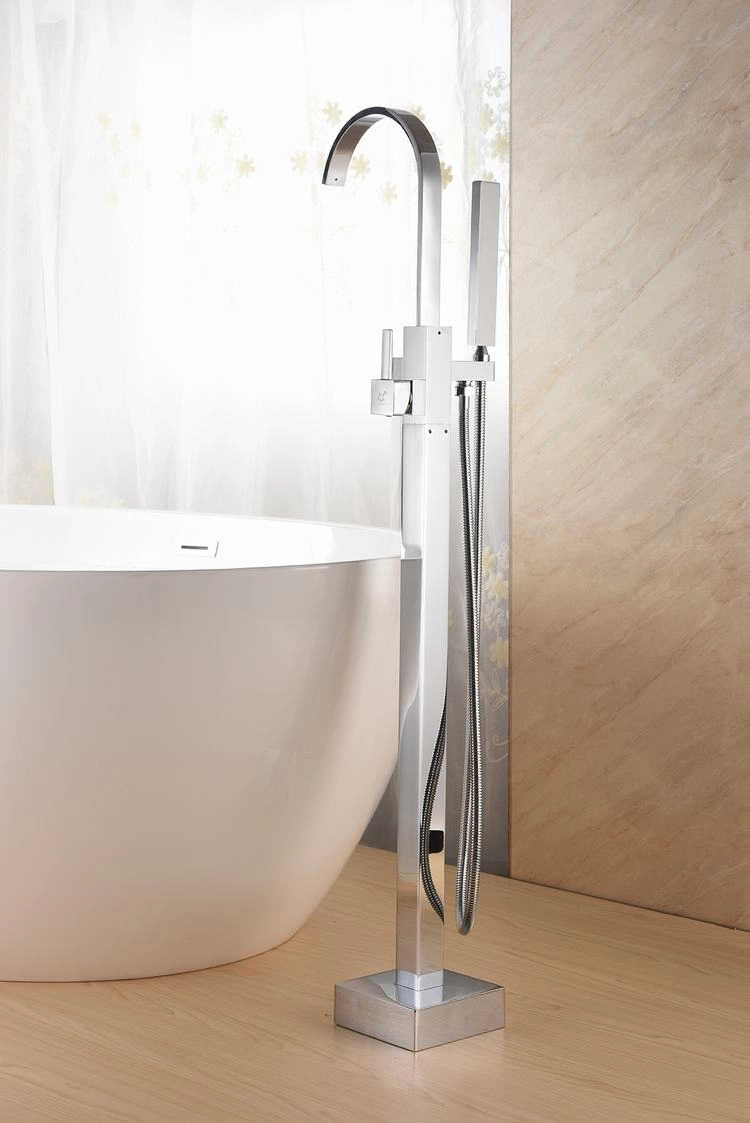 The DF-02014PC Polished Chrome Freestanding Bathtub Faucet is a sophisticated addition to any bathroom, blending timeless arched spout aesthetics with practical hand shower functionality. Made from solid brass with a square-column structure, this floor-mounted tub filler provides graceful water delivery and versatility, ideal for residential upgrades or commercial installations where style meets everyday utility.